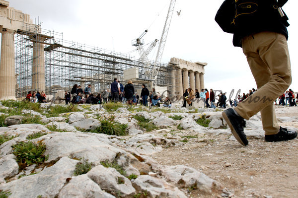 :Akropolis med Pathenon som lockar Aten turister i mängder,